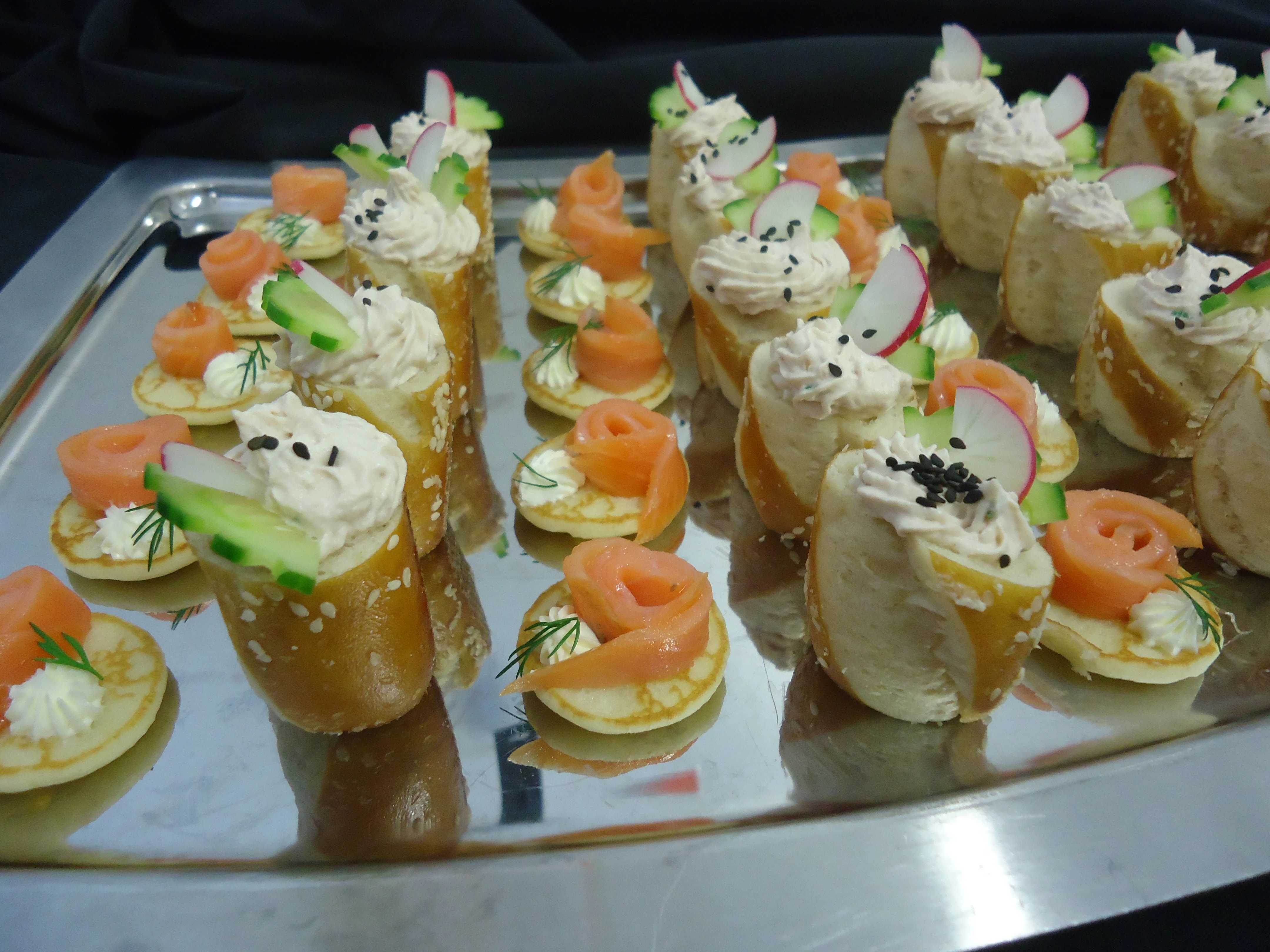 Wrap saumon fumé & verdure, Finger Mauricette bacon & tartare, crostini jambon cru, pesto & asperge, brochette de fromage, mini burger à la mousse de saumon et concombre, finger pain polaire au fromage frais et petits légumes croquants, mini Sandwiches…