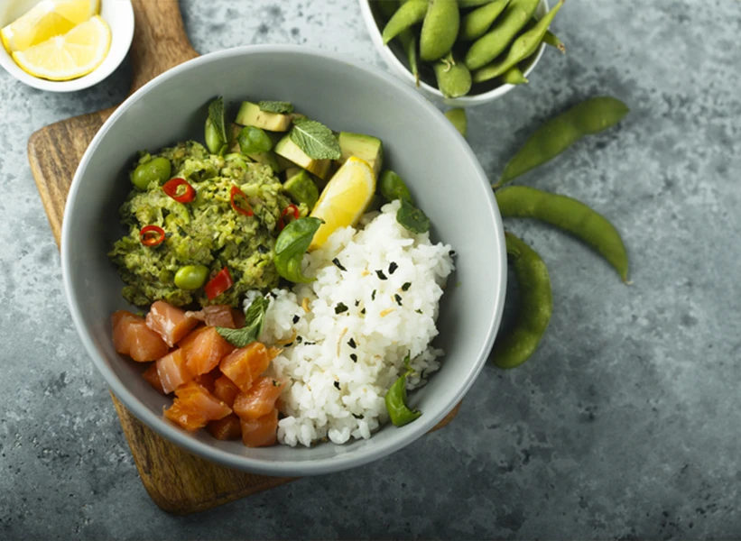 Feuilles de roquette, crudités de saison, Tomates cerise juteuses, Riz vinaigré façon sushi, Fèves edamame croquantes